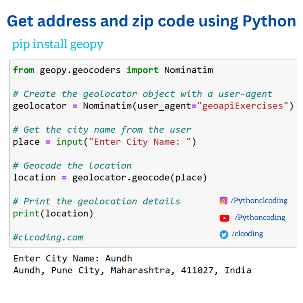 Get address and zip code using Python$1+$1+https://schema.org/InStockusdPython CodingPython CodingName a fair price:$I want this!Size475 BytesAdd to wishlist New wishlistShare on XShare on Facebook Copy linkCopy product URL